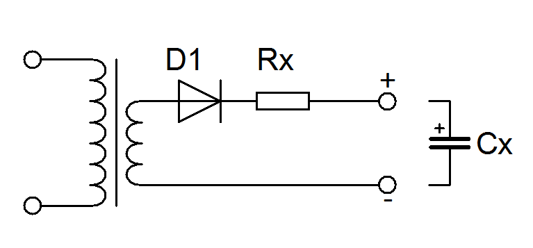 Schéma formovačky elektrolytů, kde Rx se volí podle požadovaného proudu a Cx je formovaný kondenzátor. Napětí je třeba zvolit tak, aby bylo dosaženo jmenovité napětí na kondenzátoru.