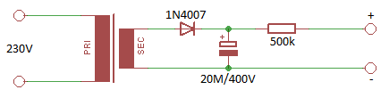 Na svorky + a - připojíme polovodičový přechod tranzistoru ve správné polaritě a paralelně na něj měříme napětí. Transformátor jsem použil z lampového rádia 230V/250V.