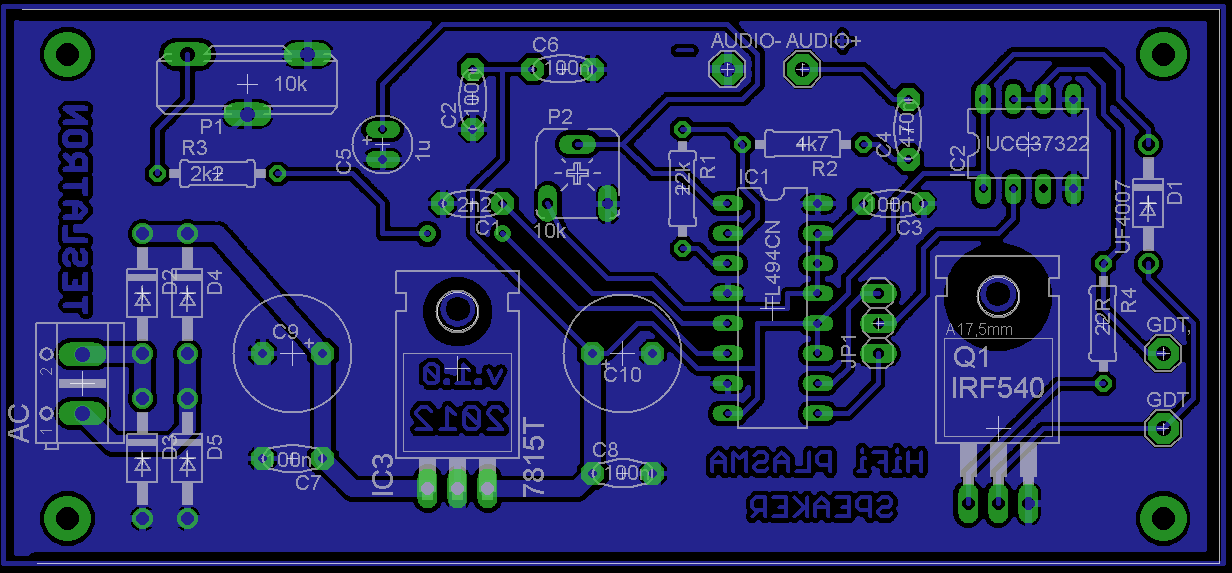 zrealizoval jsem plasmový reproduktor. Vycházel jsem z Vámi uváděných schémat, DPS mám navržen vlastní.