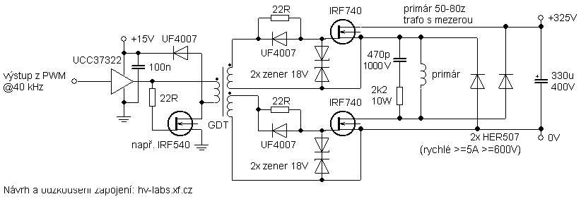 Při oživování mám velký problém s odcházením mosfetů v můstku (napěťový průraz). S největší pravděpodobností to bude způsobeno nevhodnými parametry primární cívky na VN trafu, která generuje při obdelníkovém signálu příliš veliké napěťové špičky. Mohu se Vás zeptat, jaký počet závitů a jak velikou mezeru jádra jste volil?