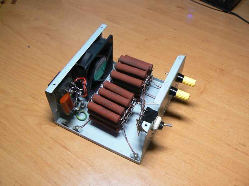 Odpory jsem uložil do krabičky PC zdroje jelikož mi vyhovovala velikostí, umístěním ventilátoru a již nafrézvané větrací otvory. Cele to vypada takto: