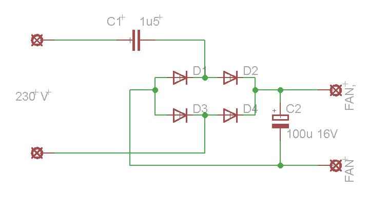 Celkem na to padlo 27 kusů rezistorů. Pokud by jsme počítali 25x15 výjde nám zatížitelnost 315W při 4R a 185W při 8R. Jelikož se jedná o kvalitní odpory, na kterých se nešetřilo materálem kratkodobě by vydržely daleko víc, jen nevím jak by se nato tvářily pájené spoje. Abych co nejvíce eliminoval zahřívání použil jsem i původní větrák zdroje, u kterého jsem řešil poměrně neobvyklé napájení přímo ze sítě. Nikoho nenabádám aby to zapojoval steně jako já a doporučuji použít transformátor se stabilizátorem na 12V. Jen pro islustraci a možnost kritiky přidávám schéma. V zapojení by měla být ještě zenerka, žádnou výkonější jsem doma neměl přišel jsem ale nato, že zenerky netřeba, kondenzátor omezí proud na nějakých 100mA a napětí při zátěži ventilátorem se drží na 8,2V na profouknutí celé krabičky to bohatě stačí.