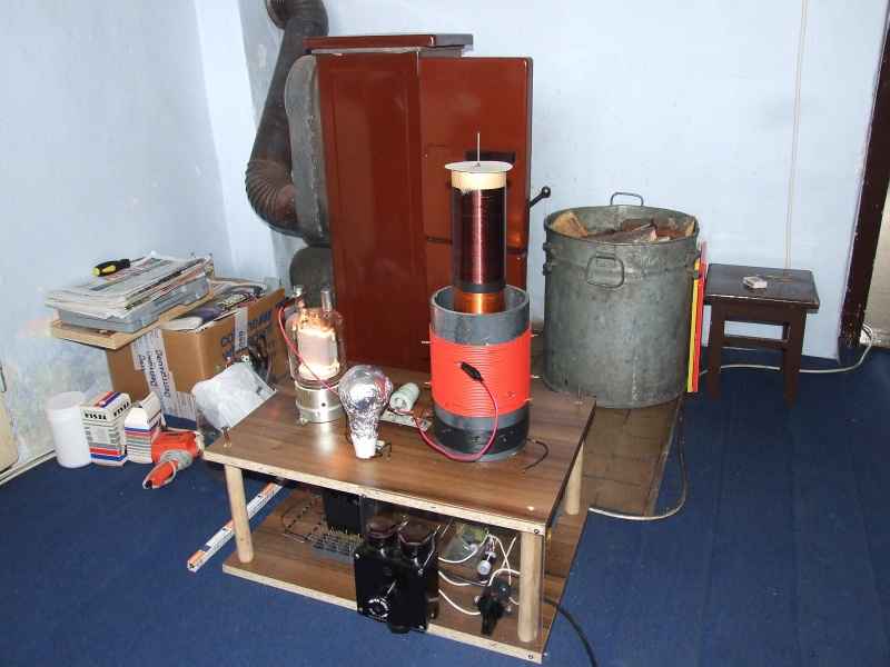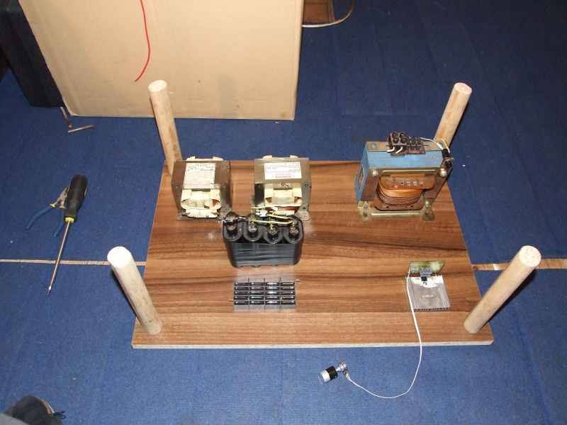 ZDE. K napájení jsou použité dva paralelně spojné MOTy se zdvojovačem. Dále následuje blokovací kondenzátor 22n/15kV poskládaný z MMC. Žhavení elektronky zajišťuje trafo 12V/26A (315VA), které dává naprázdno 13V a po zatížení elektronkou klesne na 12,5V. Elektronka pracuje v triodovém zapojení, tzn. že mřížky G1 a G2 jsou spojeny. Jako mřížkový odpor slouží žárovka 150W/230V. Sekundár je navinut drátem 0,5mm (+- 800z) na šířce 8cm o délce 40cm. Primár je vinut na PVC o průměru 18cm, na ní jsem navinul 40z s odbočkami. Pod primárem se nachází FB vinutí s 17z také s odbočkami. Rezonanční kondenzátor obsahuje dva pulzní kondenzátory 680p/6kV/15kVA paralelně. K regulaci výkonu je použitý jednoduchý triakový regulátor. Výboje přeskakují 30cm pravítko.